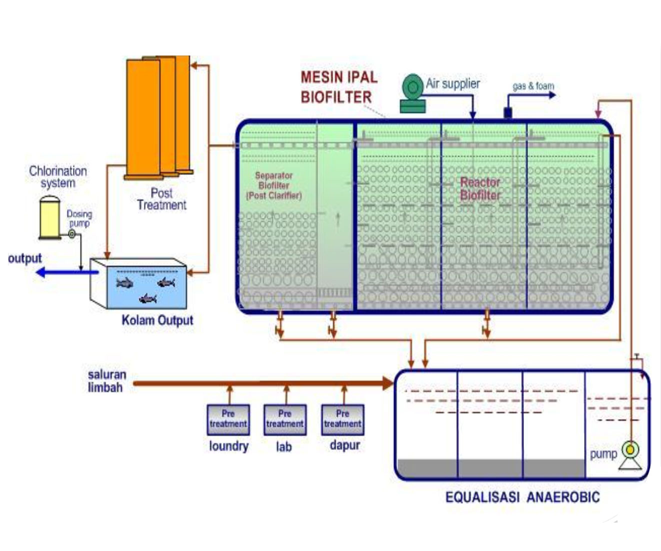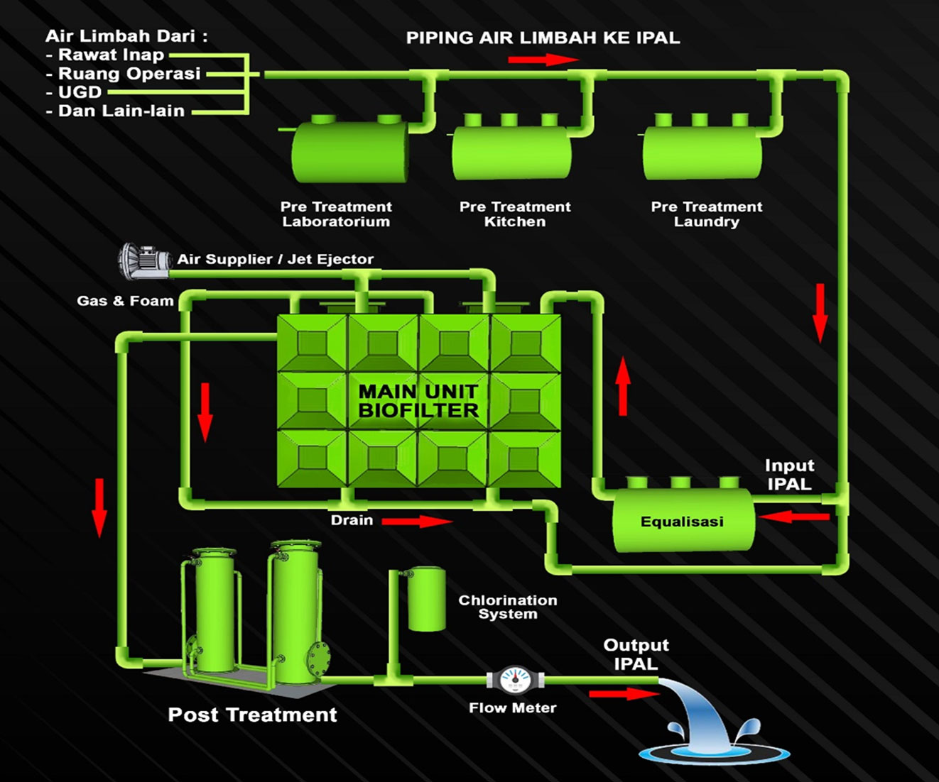 Sistem alat pengolahan limbah ini mencakup IPAL Biofilter dan Incinerator Limbah B3